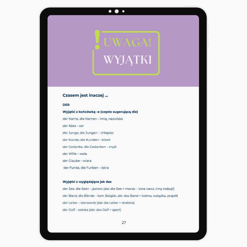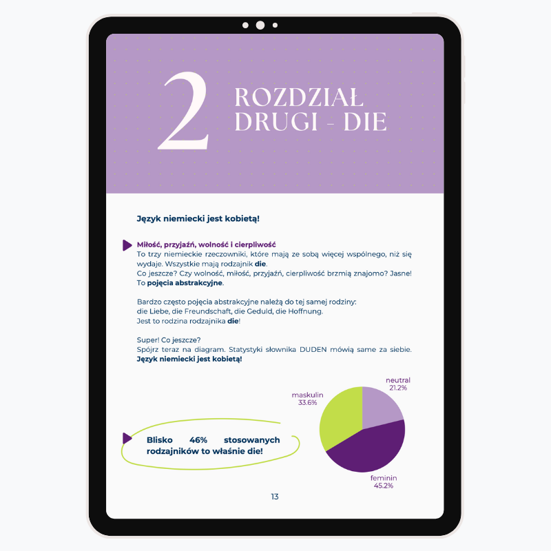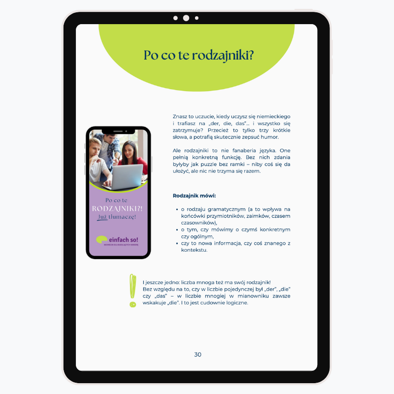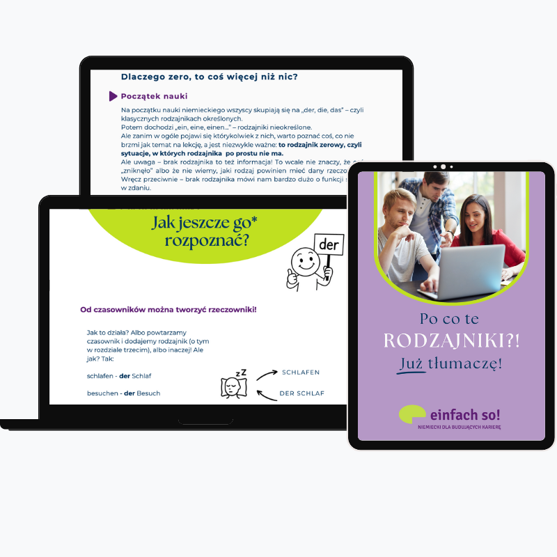 „Rodzajniki w języku niemieckim zawsze były dla mnie zmorą, ale dzięki e-bookowi i zajęciom w einfach so! w końcu zaczynam je rozumieć i lubić. W tym e-booku każdy rodzajnik jest opisany w osobnym rozdziale z przykładami i ich tłumaczeniami, jest tez wzmianka o rodzajniku zerowym czy wyjątkach. E-book jest napisany w sposób zwięzły i przystępny, po prostu przyjemnie się z niego korzysta. Bardzo polecam!”